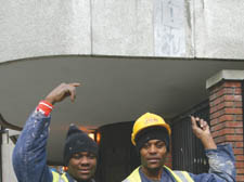 Builders Hughton Platt and Tommy Kerr admire the Banksy art, complete with its new square perspex sheet