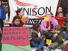 DOZENS of parents and children sat down for an impromptu protest “picnic” on the steps of Islington Town Hall last night (Thursday) . The demonstration (right) outside a full meeting of Islington council was against the plan to close Andover nursery in Seven Sisters Road, Finsbury Park.